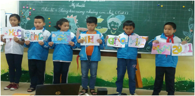 Sau khi được cô giáo hướng dẫn chi tiết, mỗi bạn đã tự trang trí bài vẽ chữ, tô màu trên giấy theo cảm nhận cá nhân. Sau phần thực hành, đại diện mỗi nhóm tự tin đứng lên trình bày và chia sẻ sản phẩm của nhóm mình. Phần huyết trình của các nhóm sinh rất chân thực, hóm hỉnh đã khiến buổi học trở nên thú vị hơn bao giờ hết.