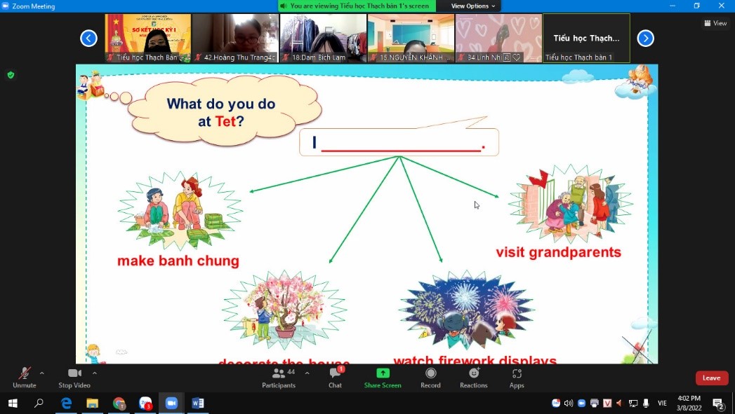 Ngày 8/3, cô giáo Nguyễn Thị Huyến - giáo viên dạy bộ môn Tiếng Anh trường Tiểu học Thạch Bàn A đã day tiết kiểm tra nội bộ lớp 4C - Unit 15: When’s Children’s Day? ( Lesson 2). Với nhiều hình thức dạy học trực tuyến phong phú, cô giáo đã truyền cảm hứng học tập cho học sinh và nâng cao chất lượng giảng dạy trực tuyến bộ môn Tiếng Anh.