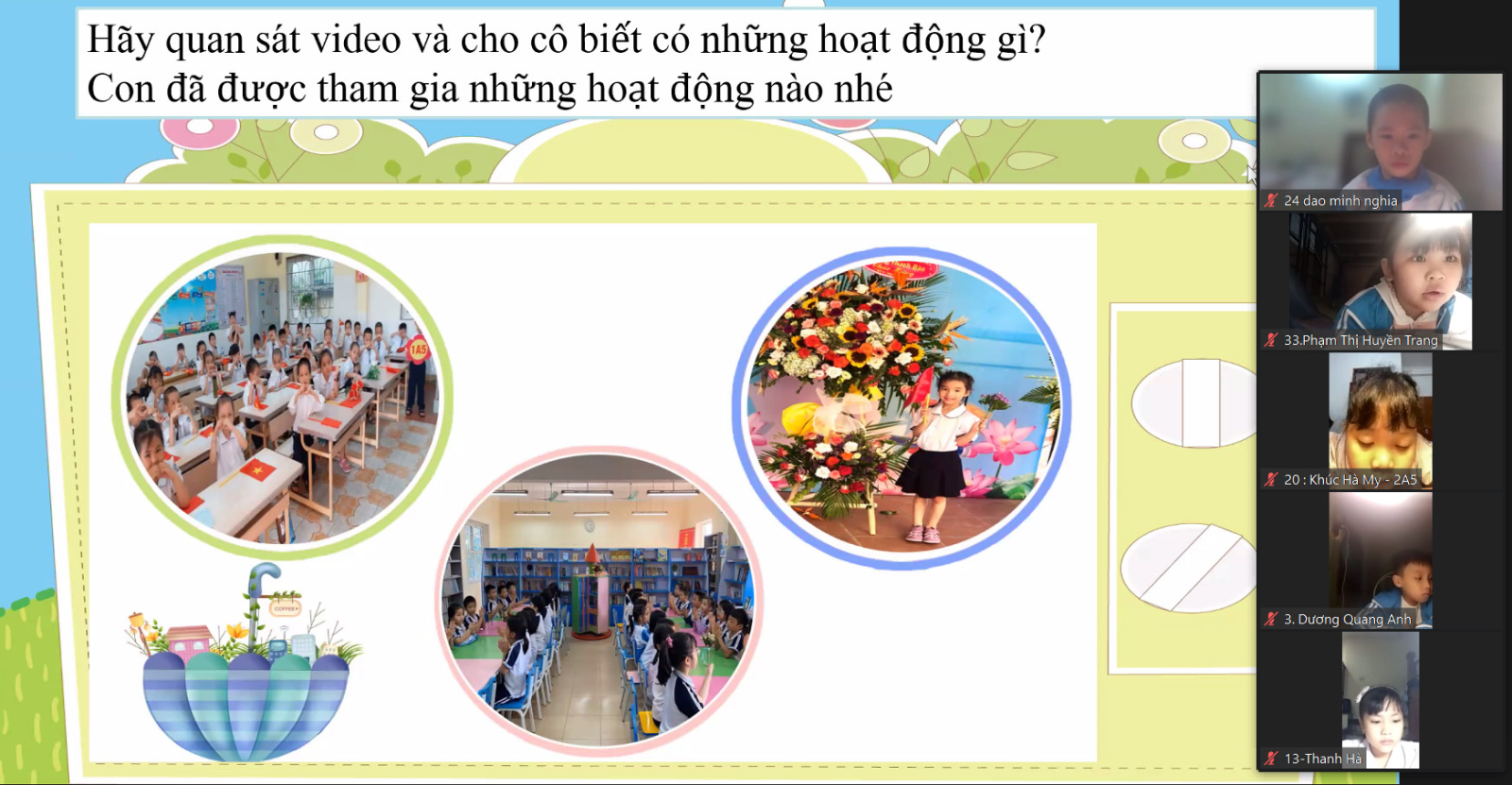 Ở hoạt động “Nói và nghe về Ngôi trường của em”, học sinh được chia sẻ với nhau trong nhóm 5 rồi chia sẻ trước lớp. Giáo viên sử dụng phương pháp chia nhóm trong phần mềm Zoom. Tuy mới lớp 2 nhưng các bạn đã rất tự tin, sử dụng từ ngữ trình bày tốt. Các bạn trong lớp lắng nghe bạn, thả tim nếu yêu thích phần trình bày của bạn. Cô giáo đã ứng dụng phần mềm Padlet, tạo lớp học 2A5 để HS đăng tải phần giới thiệu về ngôi trường mình yêu thích.