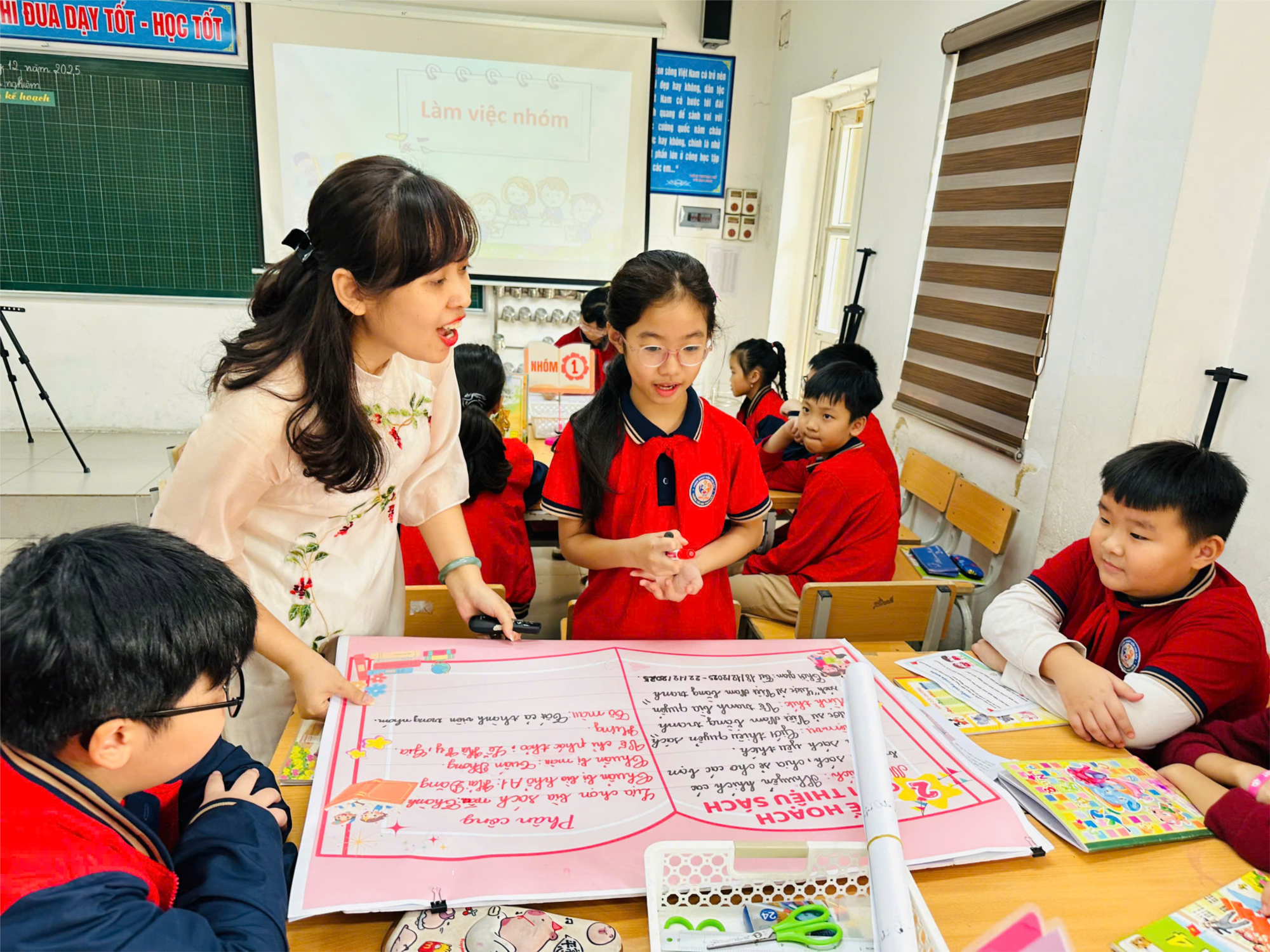 Cô giáo và các bạn học sinh nhóm 1 cùng trao đổi