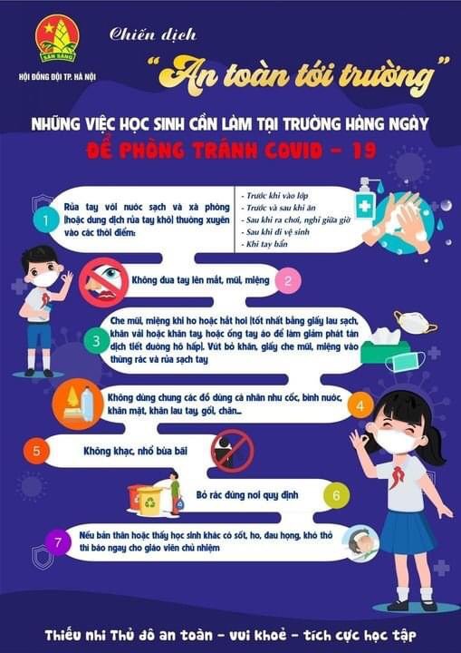 Để chuẩn bị cho việc quay lại trường an toàn, Ban chấp hành Hội đồng Đội Thành phố Hà Nội đã ban hành công văn số 5191-CV/TĐTN-CTTN về việc triển khai chiến dịch “An toàn tới trường” với 7 lưu ý dành cho học sinh như sau: