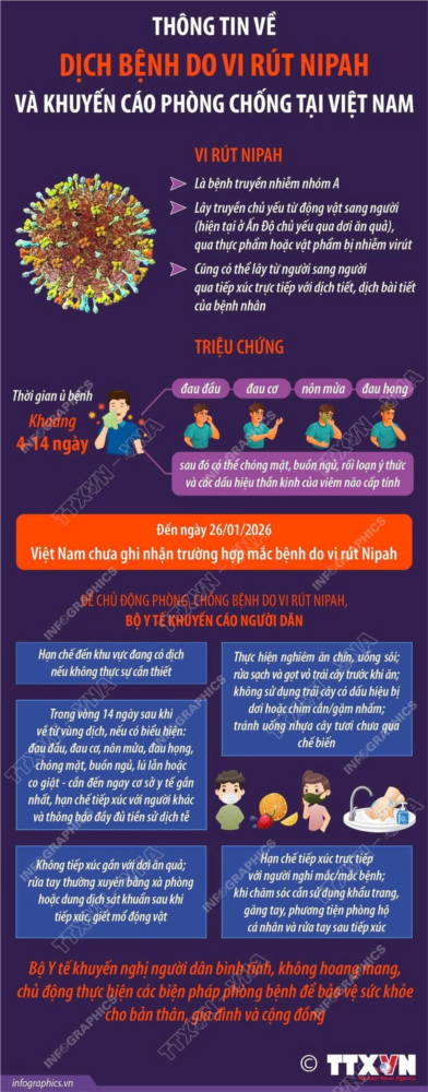Theo Tổ chức Y tế Thế giới (WHO), bệnh do vi rút Nipah được ghi nhận rải rác tại một số quốc gia, chưa tạo thành các ổ dịch lớn, tuy nhiên tỷ lệ tử vong ở các trường hợp nhập viện dao động từ 40-75%. Hiện nay chưa có vắc xin và thuốc điều trị đặc hiệu cho cả người và động vật. Vi rút Nipah là bệnh truyền nhiễm nhóm A, lây truyền chủ yếu từ động vật sang người (hiện tại ở Ấn Độ chủ yếu qua dơi ăn quả), qua thực phẩm hoặc vật phẩm bị nhiễm vi rút; đồng thời cũng có thể lây từ người sang người qua tiếp xúc trực tiếp với dịch tiết, dịch bài tiết của bệnh nhân. Thời gian ủ bệnh khoảng 4-14 ngày, người nhiễm có thể xuất hiện các triệu chứng như: đau đầu, đau cơ, nôn mửa, đau họng; sau đó có thể chóng mặt, buồn ngủ, rối loạn ý thức và các dấu hiệu thần kinh của viêm não cấp tính. Đến ngày 26/01/2026, Việt Nam chưa ghi nhận trường hợp mắc bệnh do vi rút Nipah.