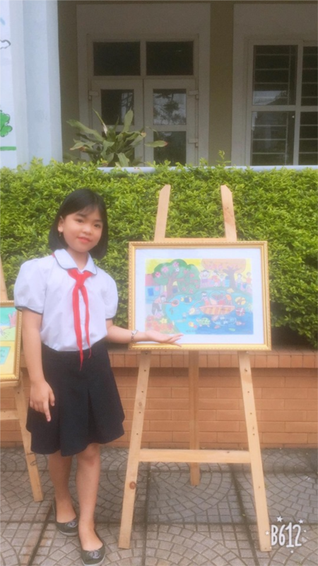 Em Vũ Thu Hoài cùng bức tranh của mình