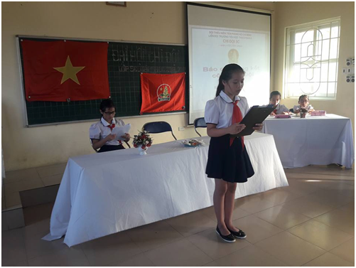 Chương trình Đại hội đã diễn ra nghiêm túc và ý nghĩa. Sau lễ chào cờ theo nghi thức Đội, Đại hội đã nghe bạn Tú Anh đọc báo cáo tổng kết hoạt động Đội năm học 2016 - 2017 và dự thảo phương hướng hoạt động Đội năm học 2017 – 2018.