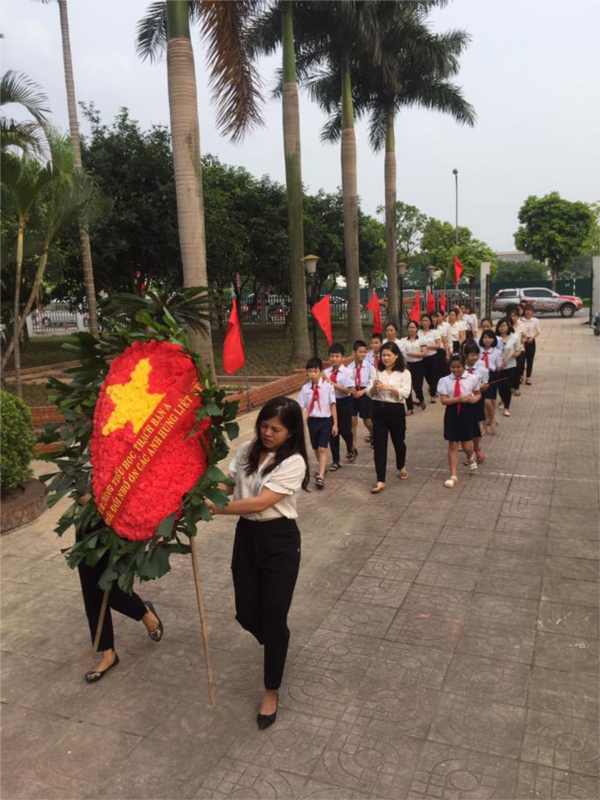 Tập thể giáo viên và học sinh của trường dâng hoa lên Đài tưởng niệm