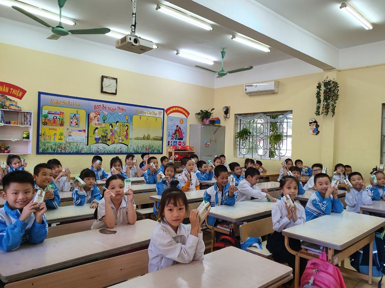 Hưởng ứng chương trình Sữa học đường, học sinh trường Tiểu học Thạch Bàn A đã đăng kí uống sữa với tỉ lệ 87%.