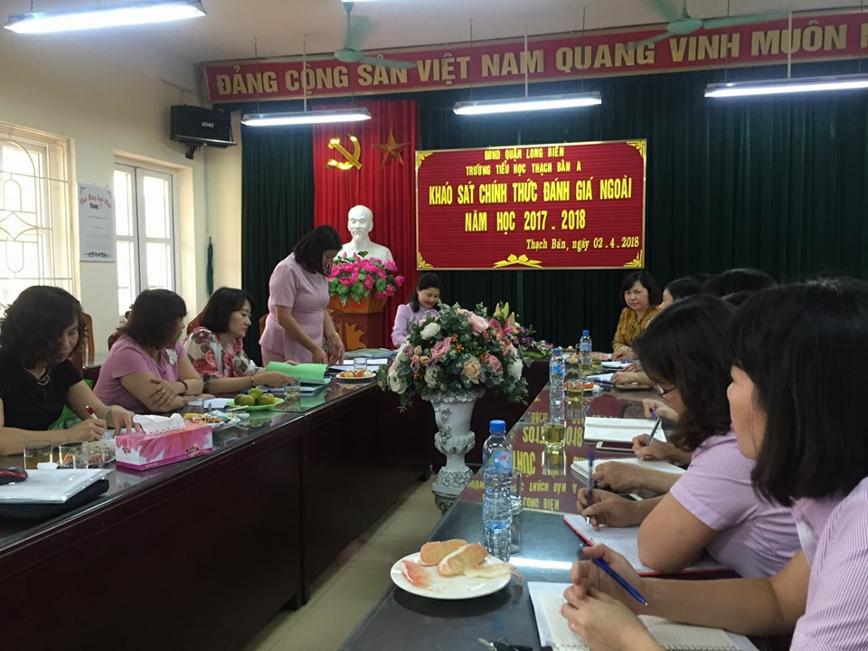 Hôm nay, ngày 2/4/2018 trường Tiểu học Thạch Bàn A đón Đoàn đánh giá ngoài (Đoàn số 32) của Sở giáo dục và Đào tạo Hà Nội về kiểm tra, đánh giá công tác Kiểm định chất lượng giáo dục trong nhà trường theo Quyết định số 337/QĐ-SGD-ĐT ngày 13 tháng 02 năm 2018 của Sở giáo dục và Đào tạo Hà Nội về việc thành lập các Đoàn đánh giá ngoài các cơ sở giáo dục phổ thông, giáo dục mầm non.