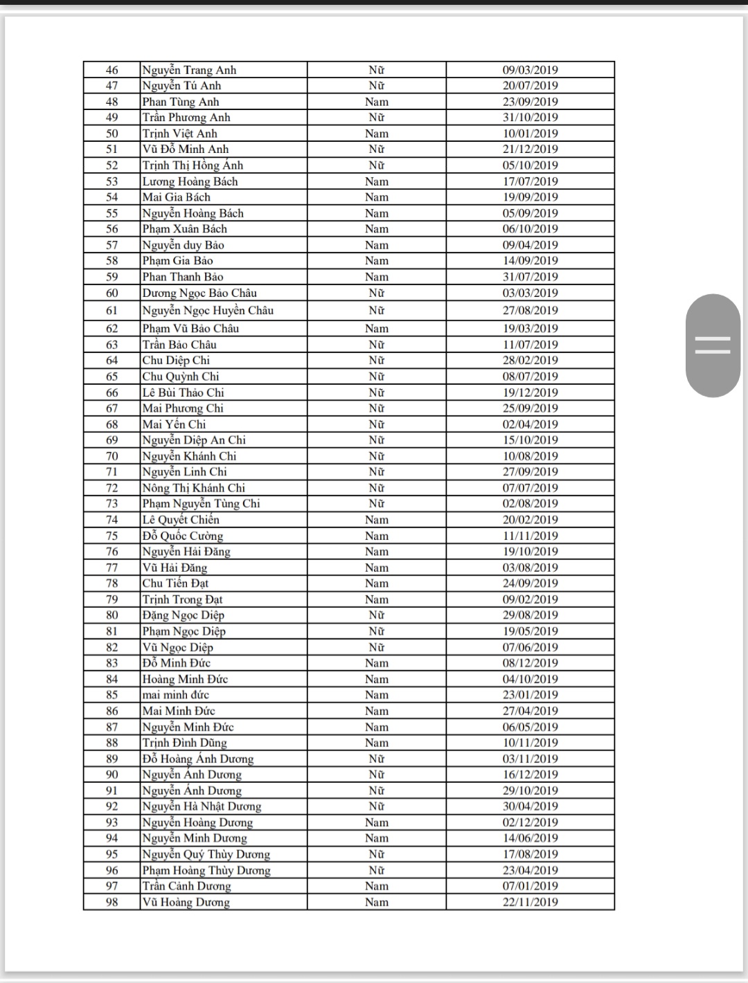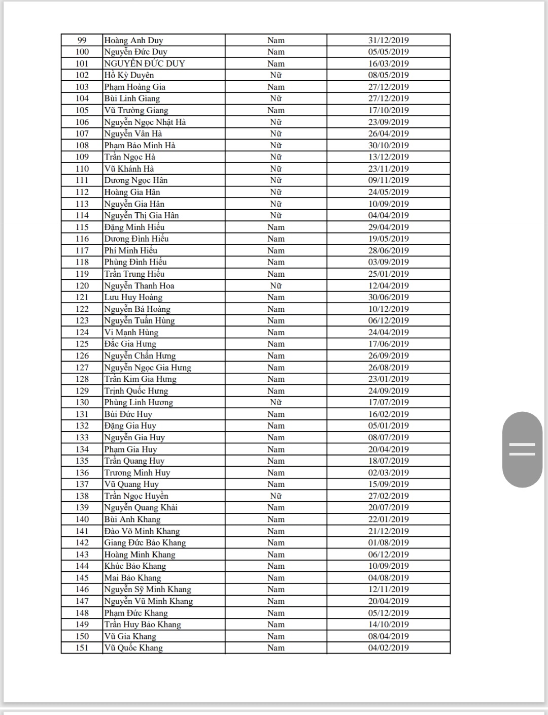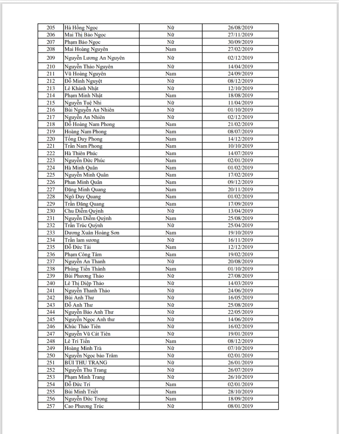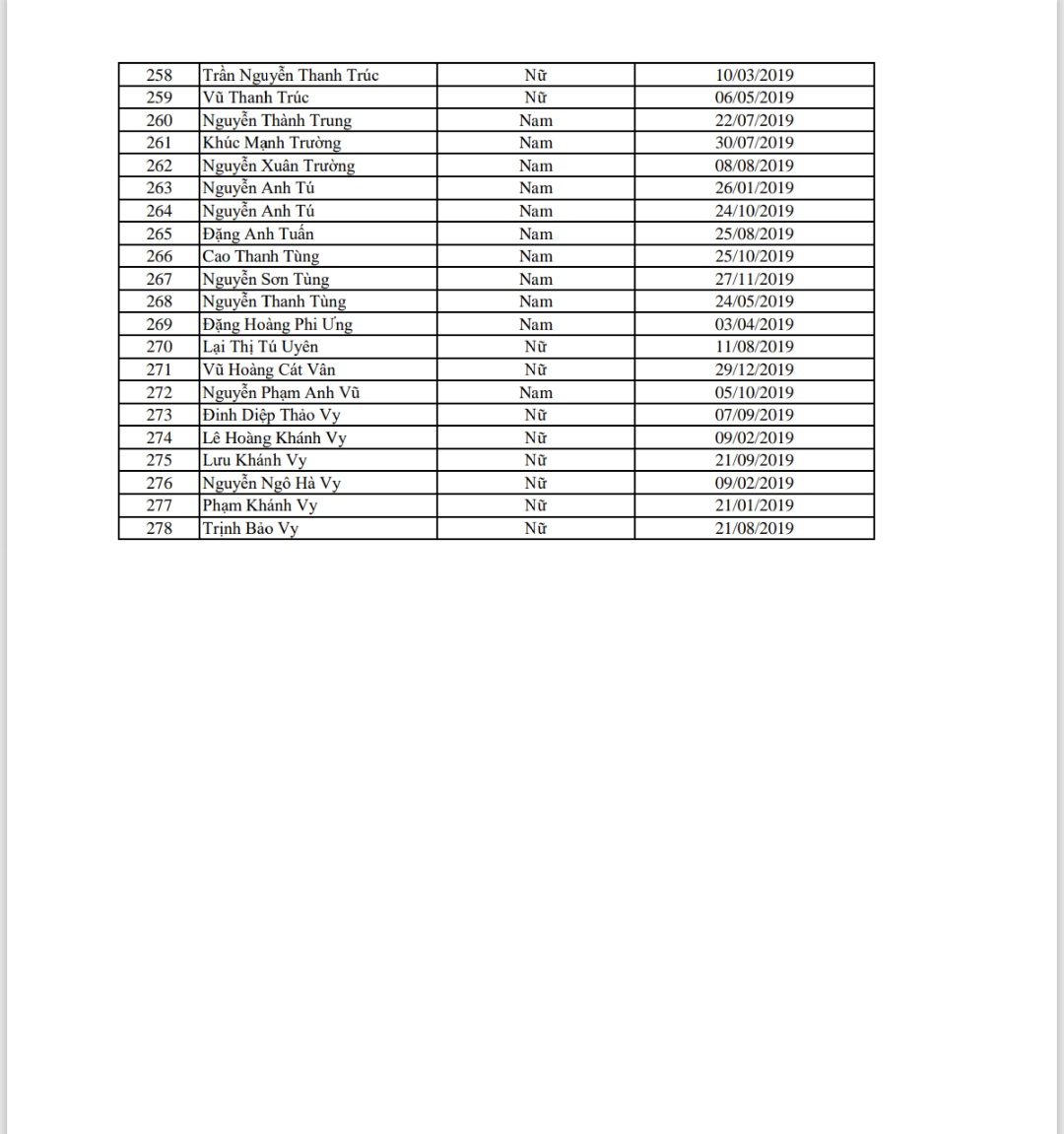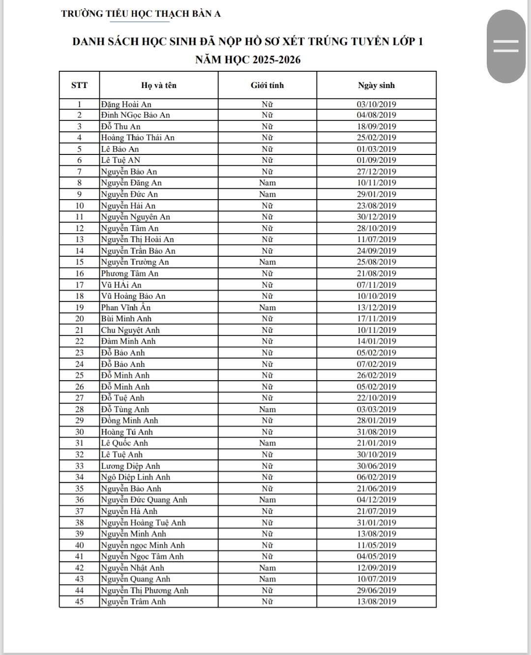 Danh sách học sinh nộp hồ sơ xét chúng tuyển lớp 1 năm học 2025-2026 trường TH Thạch Bàn A